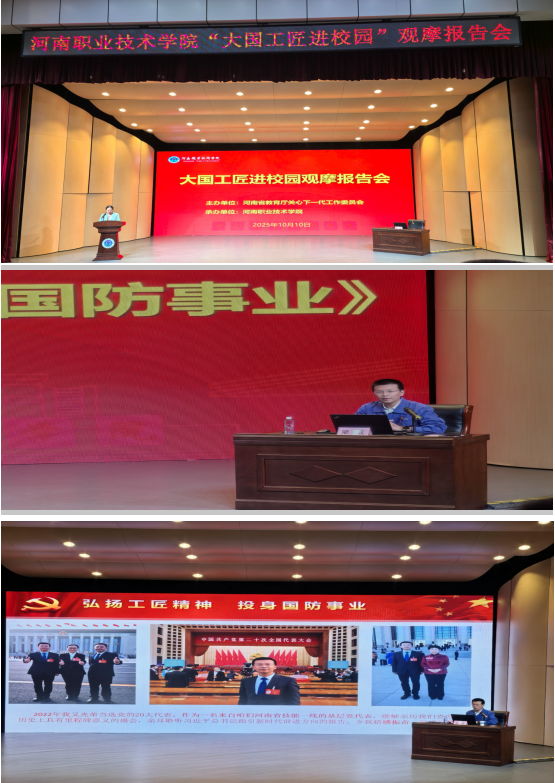 为进一步弘扬工匠精神,深化产教融合,助力学生成长成才,学校关工委10月10日下午组织师生赴河南职业技术学院参加大国工匠进校园“弘扬工匠精神,投身国防事业”为主题的观摩报告会。智能制造学院辅导员张艳于作为关工委负责老师带3名学生代表参加。