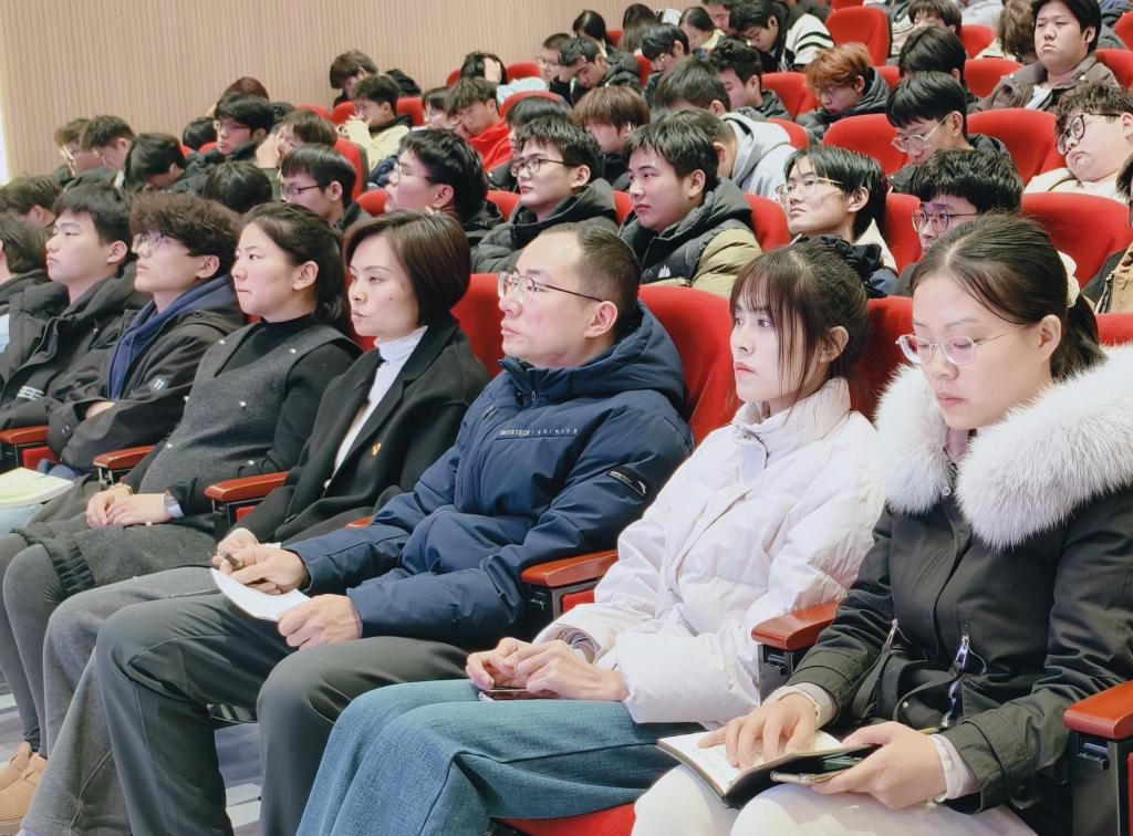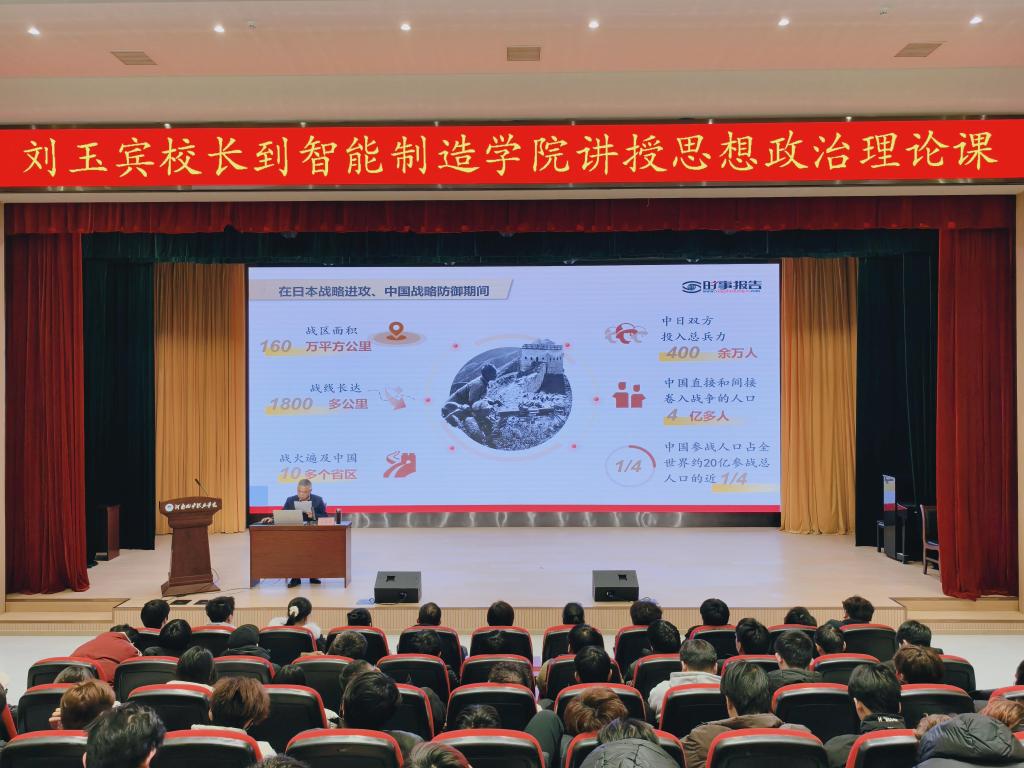 为深入贯彻落实习近平总书记关于办好思想政治理论课的重要指示精神,巩固拓展主题教育成果,引导学生铭记历史、坚定信念、勇担使命,12月17日下午,党委副书记、校长刘玉宾走进勤奋楼二楼多功能报告厅,为智能制造学院师生讲授了一堂深刻而精彩的思想政治理论课。本次授课由智能制造学院党总支书记马瑾瑞主持,200余名师生到场聆听学习。