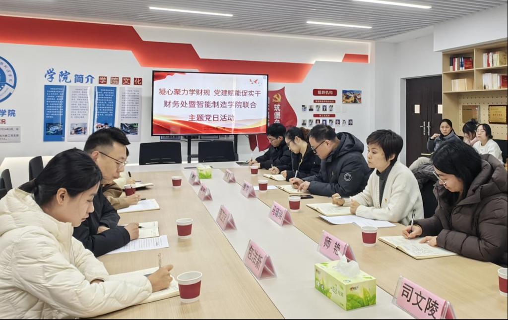 1月6日上午,财务处与智能制造学院联合开展“凝心聚力学财规 党建赋能促实干”主题党日活动,深化党建与业务融合,筑牢财经纪律防线。活动由学院党总支书记马瑾瑞主持,财务处处长张卫民率孙宇、包洁新、苗倩倩一行,与学院院长娄阳、副院长禹露、教研室主任司文陵及专任教师代表、辅导员座谈研讨。